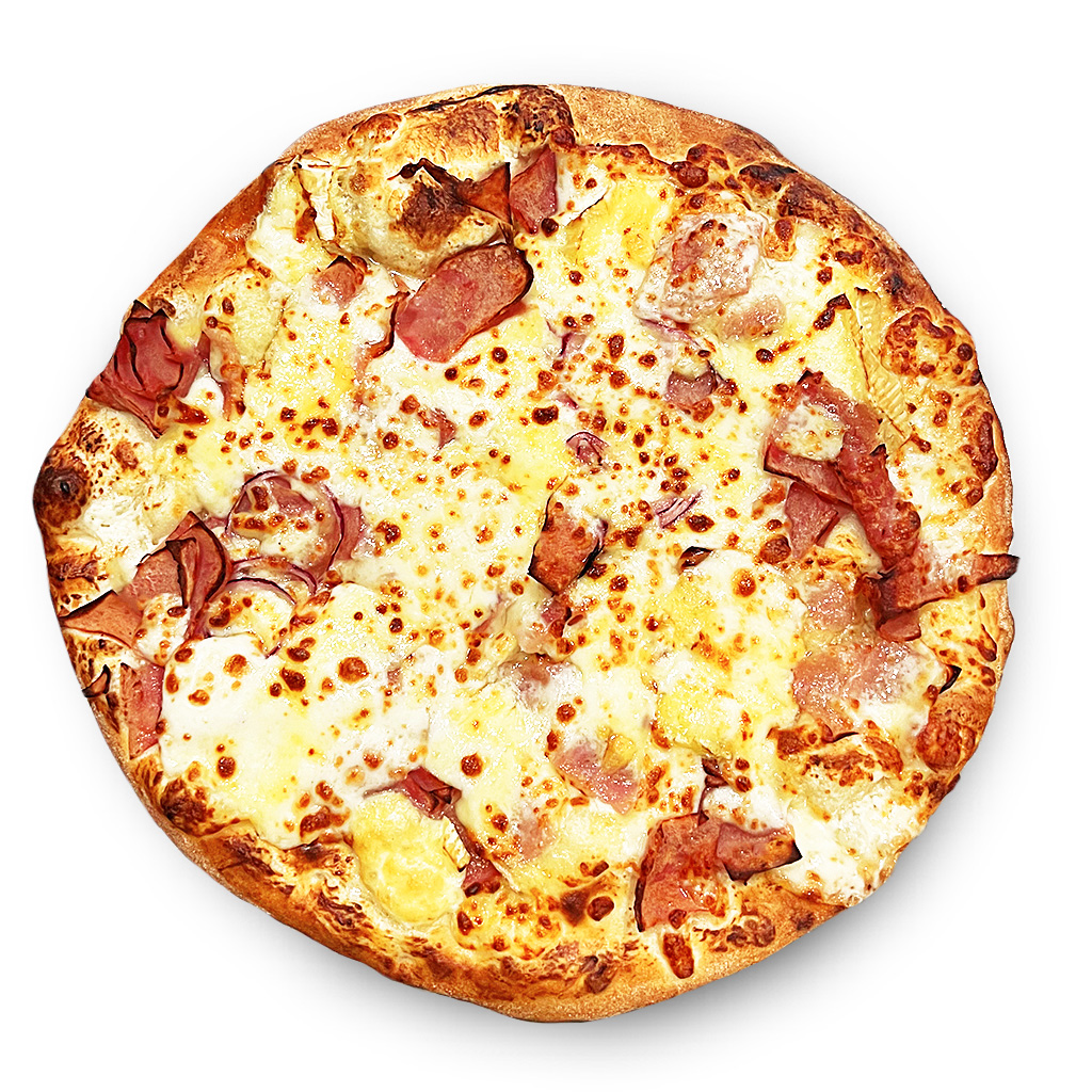 Mozzarella, Jambon*, oignons, poivrons, olives, artichauts.